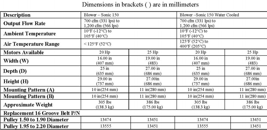 Output flow rate: 700 cfm(331 lps) to 1200 cfm(566 lps)