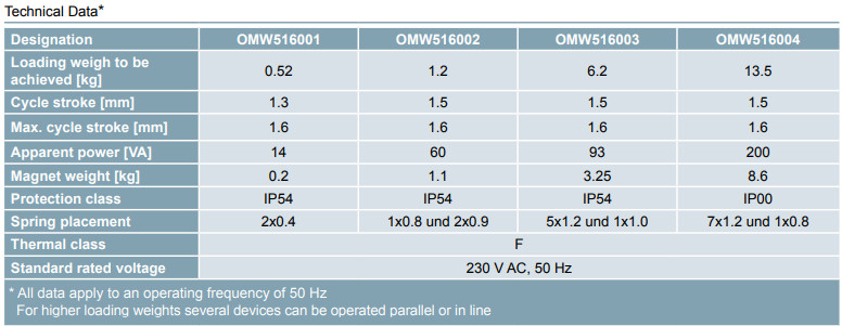 List type : Kendrion OMW516001, Kendrion OMW516002, Kendrion OMW516003, Kendrion OMW516004.